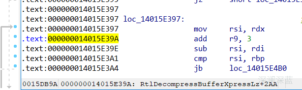 我们现在已知蓝屏的直接原因是释放内存的操作引起的,那么问题就显然出现在成功申请内存之后,到释放内存之间的这个过程中。我们看到这个过程中只有一个处理函数,即RtlDecompressBufferEx2。